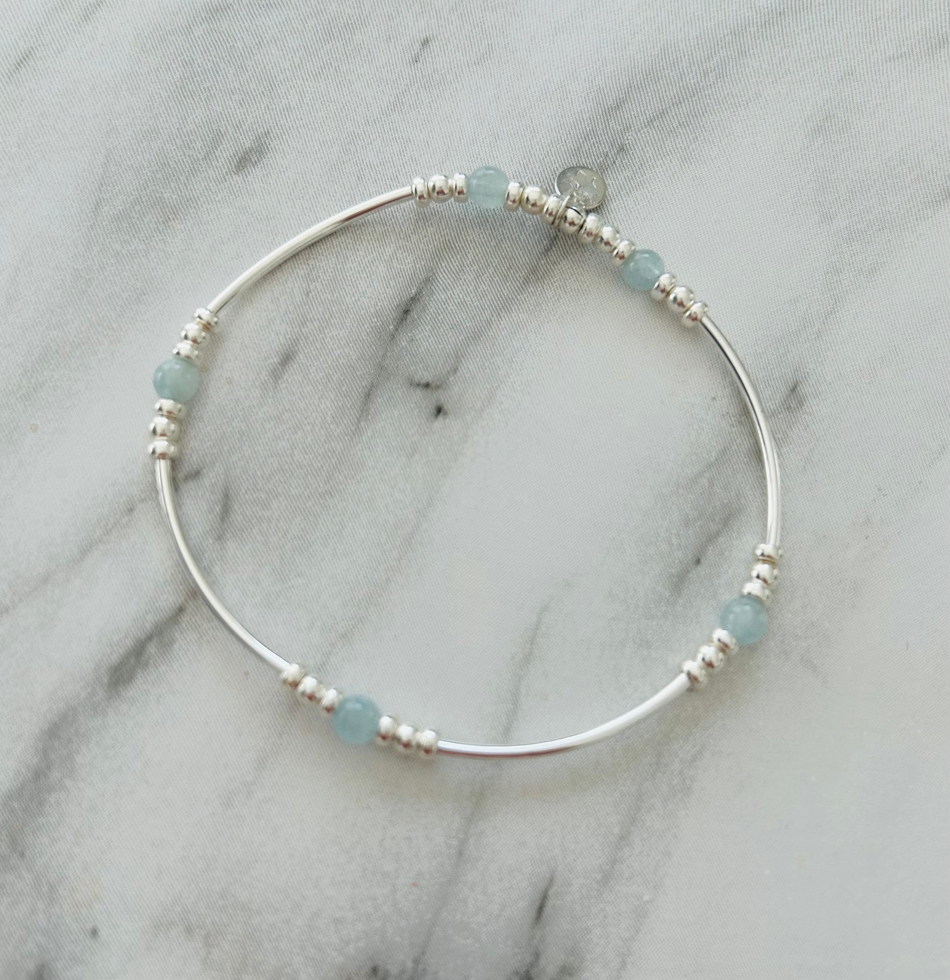 This Aquamarine Bangle, crafted in sterling silver or gold-filled beads, features the calming beauty of aquamarine, believed to symbolize tranquillity and clarity. The sterling silver option offers a timeless, hypoallergenic finish, while the gold-filled variant brings a warm, durable glow. Both settings enhance the stone’s serene blue hues, making this bangle a refined piece that supports emotional balance and promotes clear communication. Ideal for everyday wear or special occasions, it combines expert craftsmanship with meaningful elegance.