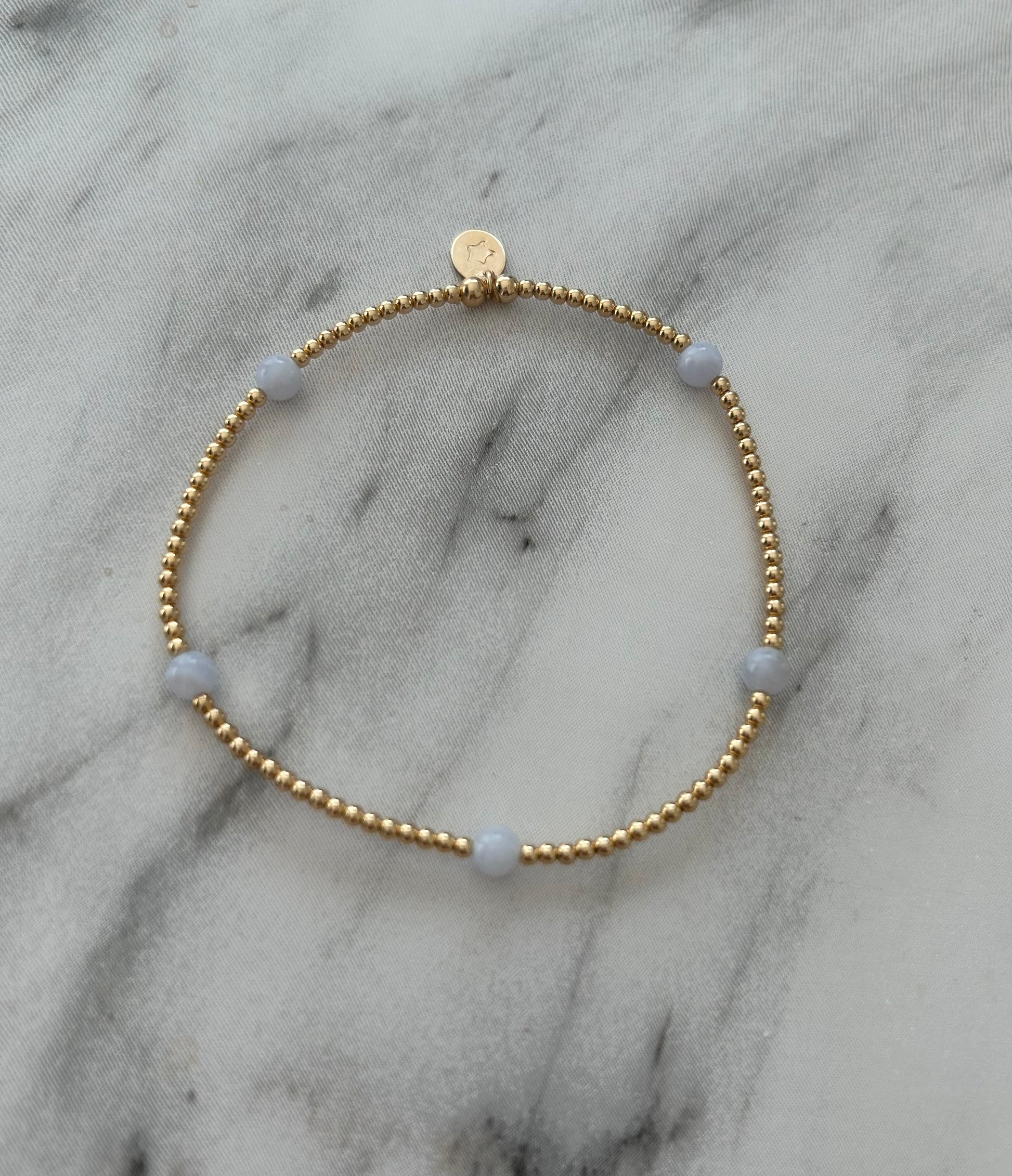 The Blue Lace Agate Elegance Bracelet features delicate blue lace agate, prized for its calming and healing properties that encourage clear communication and emotional balance. Expertly crafted with 925 sterling silver and gold-filled elements, this bracelet combines natural beauty with lasting quality. Its soft blue hues paired with refined metals create an elegant accessory that supports tranquility and sophistication in everyday wear.