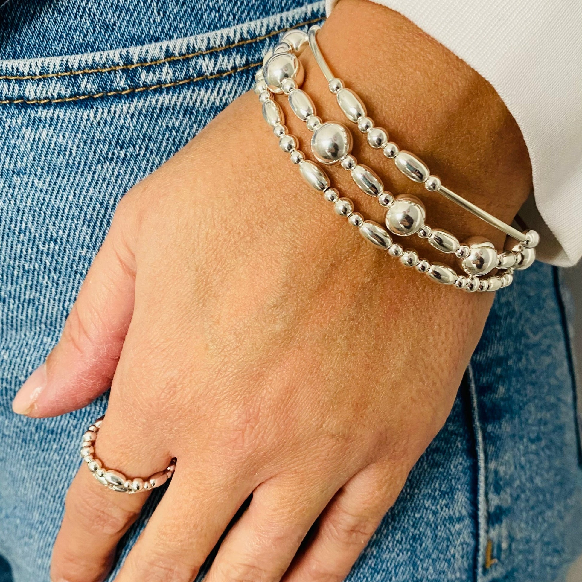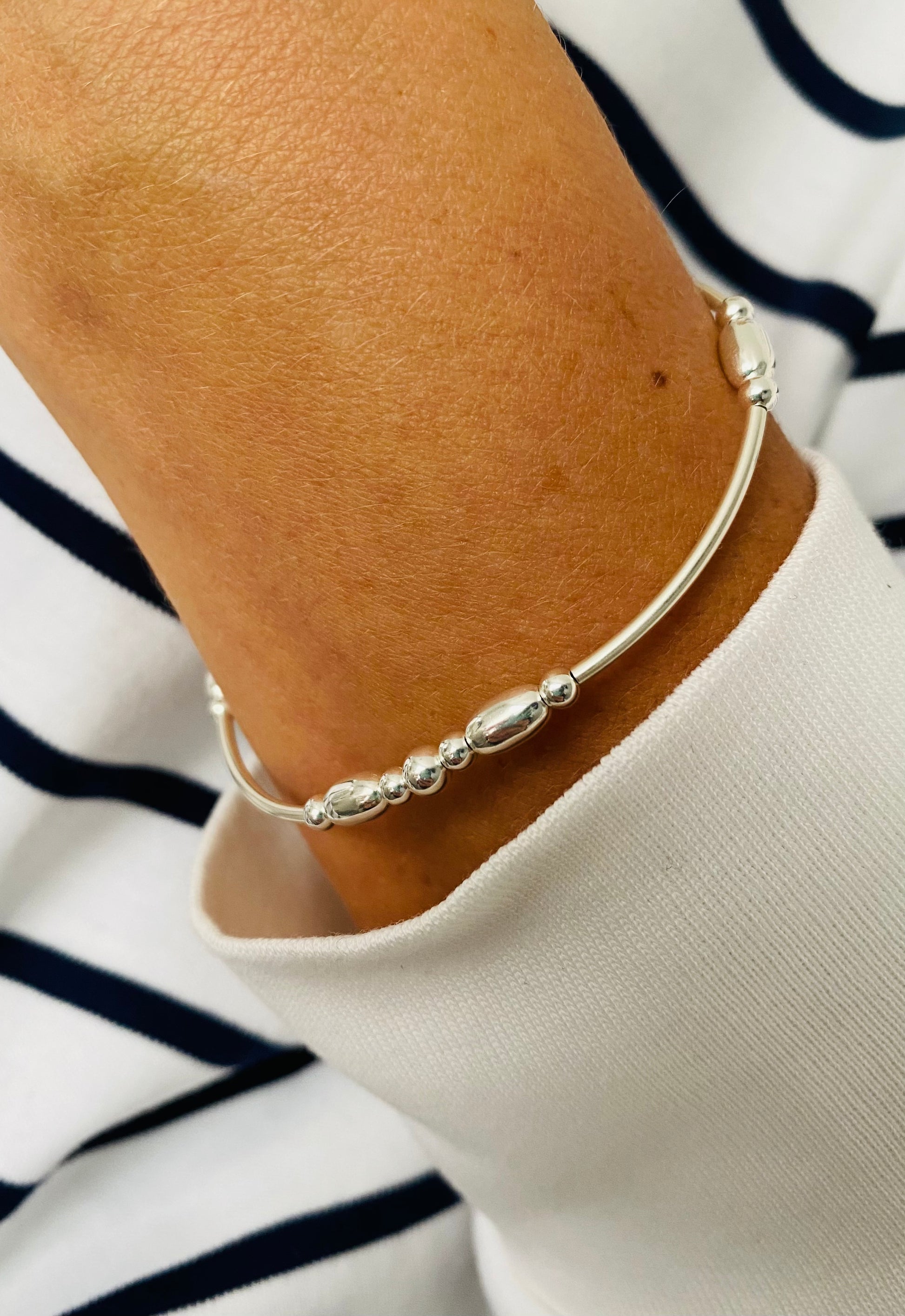 A Beautiful hand beaded bracelet, made from 925 Sterling silver, alternating oval & round beads and noodle beads.