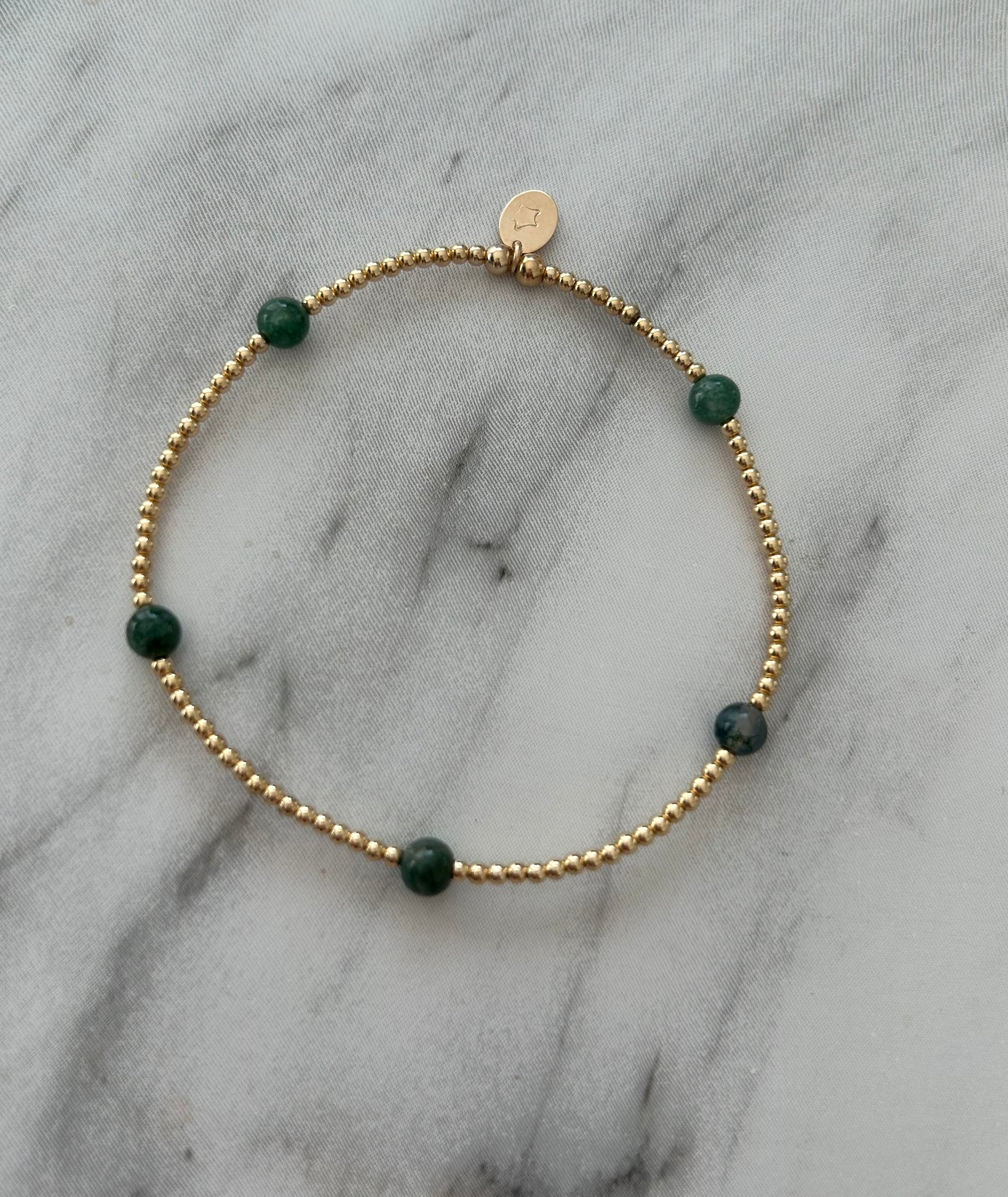 The Green Moss Agate Stacking Bracelet, crafted in sterling silver or gold filled, features the soothing green hues of moss agate, a stone known for its connection to nature and growth. Moss agate is believed to promote emotional balance, stability, and new beginnings, making this bracelet both a stylish accessory and a symbol of renewal. Its quality materials ensure lasting elegance, perfect for layering with other pieces while supporting a grounded, harmonious energy.