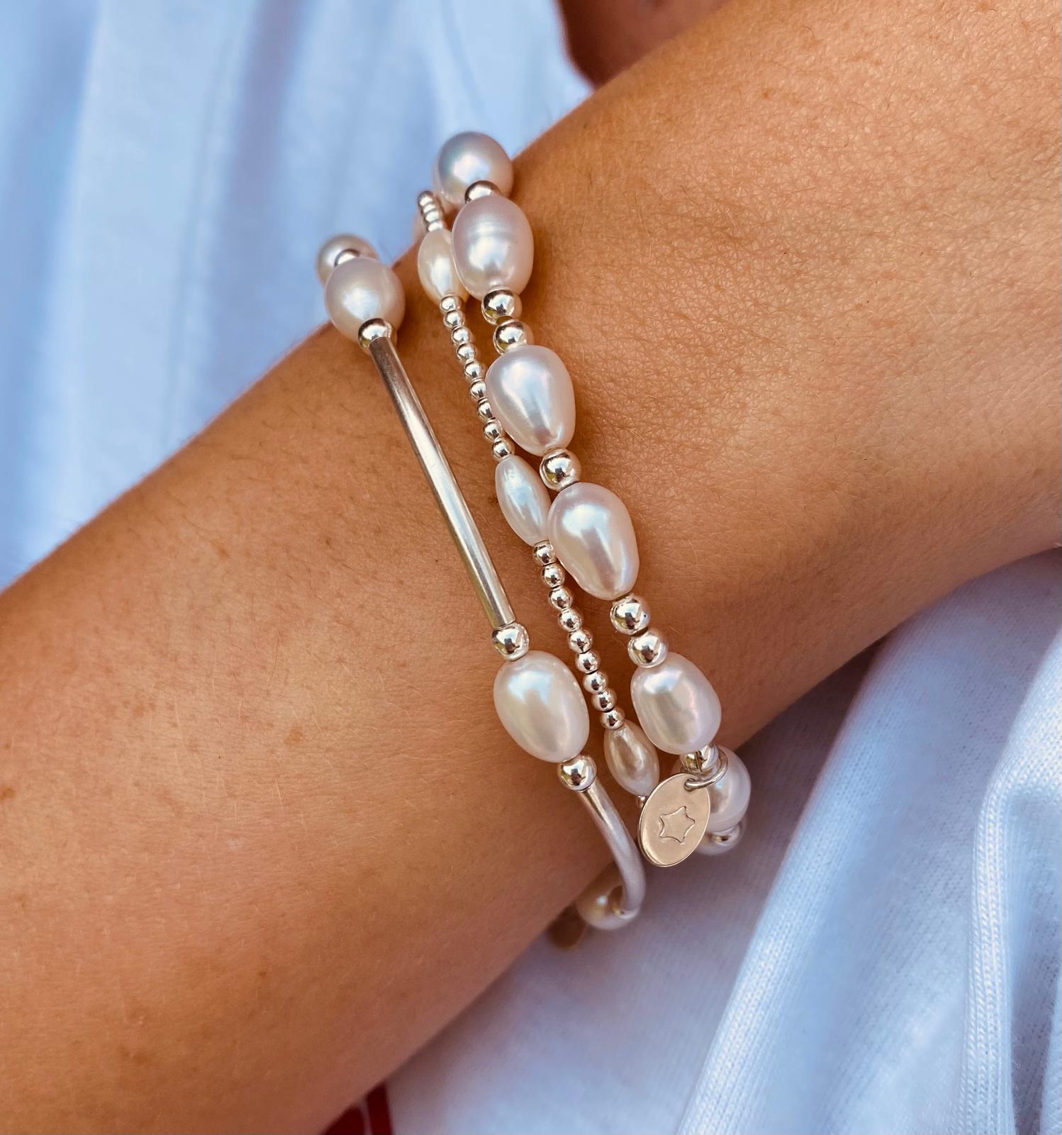 Elevate your style with this elegant pearl bangle, crafted with high-quality 925 sterling silver and lustrous freshwater pearls. Experience the natural beauty and enduring quality of carefully selected pearls, handcrafted into a timeless piece of jewellery.
