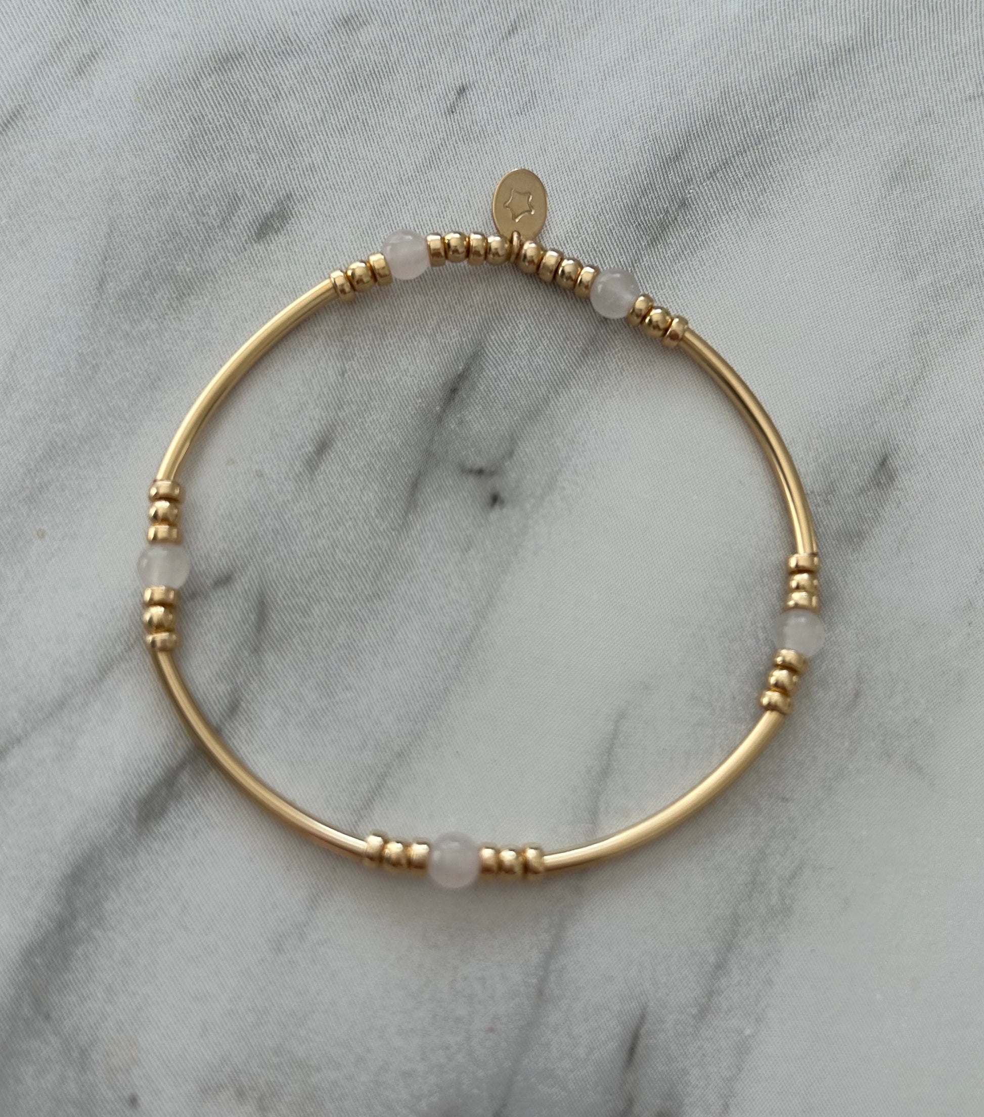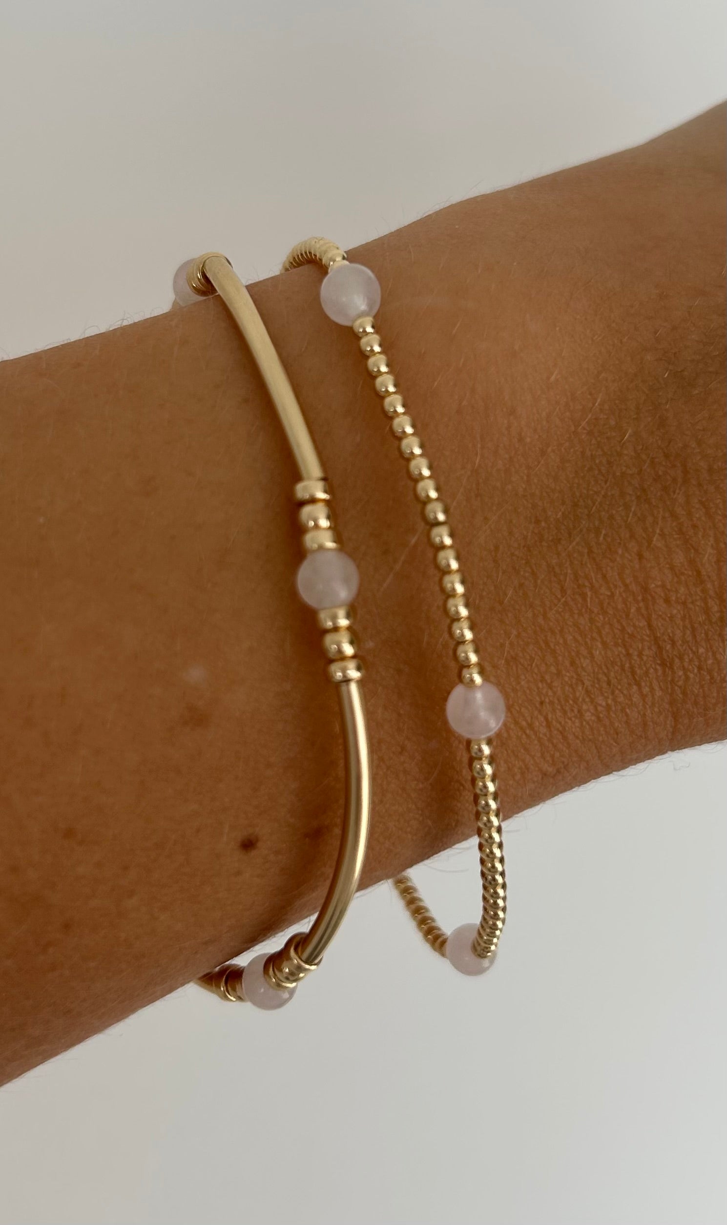 The Rose Quartz Bangle, crafted in sterling silver or gold-filled beads, features the soothing pink stone known for its association with love and emotional healing. Rose quartz is traditionally believed to promote compassion, calmness, and self-love, making this piece not only a stylish accessory but also a meaningful talisman. The choice of durable sterling silver or warm gold-filled finishes ensures lasting elegance and complements the gentle energy of the rose quartz, suited for those seeking both beauty and balance in their jewellery.